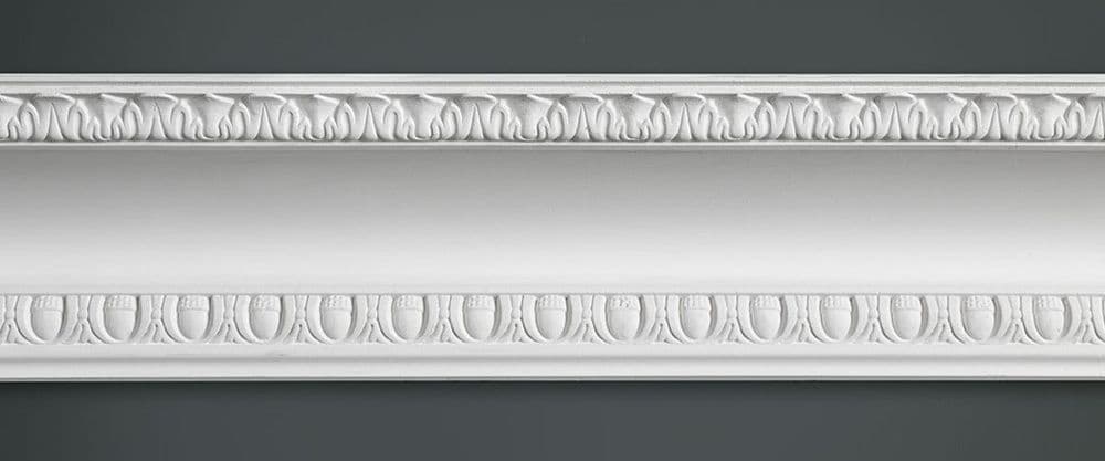 Elliptical cove with egg & dart plaster cornice design measuring 85mm x 135mm and manufactured in 3 metre lengths.